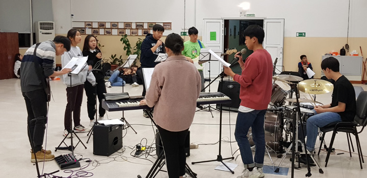 월요일 저녁, 방과 후 찬양팀 연습이 아우디토리움에서 있습니다.