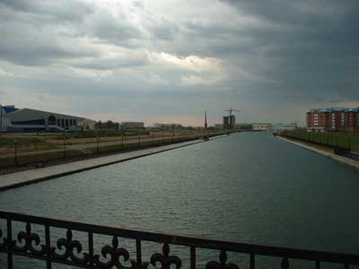 바로 그 에브라지스끼 대학에 가 보았습니다. 아스타나의 큰 강줄기 이심강은 에브라지스끼 대학으로 가는 길에도 함께 흐르고 있었고..대학의 정문으로 들어가려면 강을 건너는 다리를 건너 넘어 가야 들어갈 수 있었습니다.