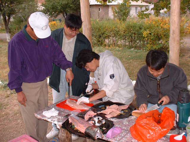 그리고...왼쪽에서 세 번째...앉아서..예리한 칼 솜씨를 보여 주고 있는 젊은 의사는 치과(구강외과) 국제협력의사인 장재필 선생님이십니다...모두들...이번 일은 외과의가 맡아야 한다고 강력하게 얘기하는 바람에 그래도...외과계인 젊은 구강외과 의사가 가장 큰 일을 맡았지요...그리고 맨 오른쪽에...차분하게 작업을 하고 계신 분이 한방과 정부파견의사이신 선종욱 선생님이십니다. 모두들...너무 열심이지요?...알마티의 한카병원은 교민사회에서도 아주 중요한 역할을 담당하고 있는 훌륭한 병원인데...이 병원 스탭진들의 이와 같은 열심(?) 때문에..사모님들도 어딜 가더라도 너무 좋아하고...항상 즐거운 얘기들만 들리지요.....