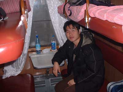 사진의 형제가 이기형 선생님입니다. 위 사진을 보시면 이곳 열차의 내부 구조를 알 수 있는데...왼쪽은 열차를 타면 나타나는 복도의 모습입니다. 외국 영화에서 흔히 보듯이 기차의 내부는 긴 복도가 있고 그 한쪽 편에 좌석을 갖춘 여러개의 객실이 쭉 들어 서 있는 구조입니다. 오른쪽 사진은 문을 열고 들어선 객실의 모습인데...4인 1실의 객실로 아래 위로 침대를 갖추고 있는 일종의 침대차입니다. 아래쪽에는 음식을 먹기 위한 조그마한 식탁이 붙어 있고....잠을 자지 않을 때는 4사람이 모두 아래층 침대로 내려와 서로의 얼굴을 보며 여행을 해야 합니다.