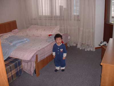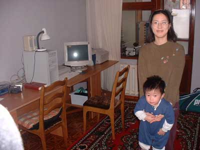 아래 왼쪽 사진은 거실로 들어오기 전에 우리 컴퓨터와 책상을 놓아 둔 작업 공간입니다. 사진에는 안 나타나지만 반대쪽에 유리 문이 달린 멋진 책장이 놓여 있고 그 안과 위 쪽에 많은 책이 꽂혀 있습니다. 이 책장 하나 만으로는 부족해서 책장 꼭대기에도 가로로 책을 쌓아 올렸습니다. 우측은 형민이가 침대가 놓인 안방에 서 있는 모습입니다. 이전 집의 경우...현관 맞은 편에 안방이 있어서 불편했었는데..이번의 경우 집의 가장 안 쪽 깊숙한 곳에 이 방이 위치하고 있어서 사생활 보장(?)이 확실하게 될 것 같습니다.