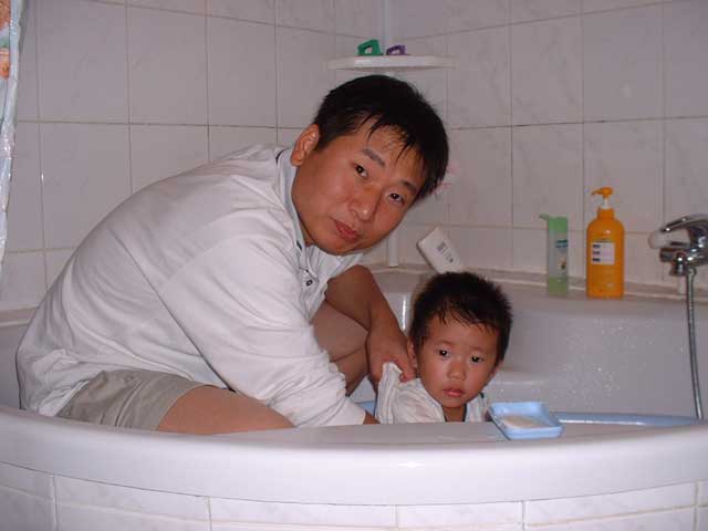 저희집 욕조는 일자형이 아니고 조개모양이라서 여유공간이 많습니다. 아빠와 함께 할 때는 자기 욕조에 들어가는 게 아니고 큰 욕조 가득히 물을 담아 놓고 하는데 마치 작은 풀장 같이 넓습니다. 게다가 형민이는 최근에 아빠가 가르쳐 준 물총 놀이를 하느라 욕조에 들어가면 나올 줄을 모릅니다.