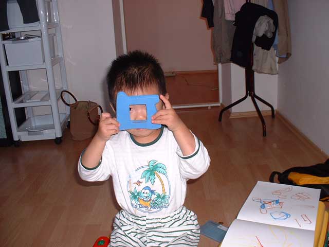 그런데.... 이러면서 아이를 기르는 것은 참 신기하다는 생각을 여러번 하게 됩니다. 특히나...전에는 전혀 하지 않던 행동을 어느 날 갑자기 조용히 하고 있을 땐 더욱 그런 생각이 듭니다. 우리는 칼과 가위는 위험하기 때문에 엄마, 아빠만 사용하는 것이라고 가르쳤고 형민이도 늘 그것들은 만지지 않고 "엄마, 아빠"하면서 자기 것이 아니라는 표현을 했었지요. 그런데 어느 날 신문지를 가지고 놀던 형민이가 한참이나 조용해서 (조용하면 반드시 사고를 치고 있는 것입니다) 가 봤더니 아니! 그 위험하다고 했던 가위를 들고 오리기를 하고 있는 것입니다. 제법 조심스럽게..... 이것을 본 뒤...다음 날 우리들은 유아용 가위를 사서 형민이에게 오리기 놀이에 사용하라고 선물했지요. 그걸 얼마나 좋아하던지..... 그래서 요즘은 아침시간에 색종이 잘라서 노트에 붙이는 놀이에 열중하고 있습니다. 물론 일부만 잘라서 손으로 쭉 찢는 것이지만 갈수록 손 놀림이 좋아지고 있습니다.