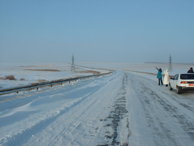 최근 아스타나를 방문한 분들을 가이드하면서... 영화 "닥터 지바고" 의 어느 장면에서 봤을 것 같은 아스타나의 차디찬 설경에 저 역시... 홀딱 반하고 있습니다. 아래 사진을 보세요... 아스타나를 방문한 KOICA 봉사 단원과 함께 아스타나 외곽 도로를 달리다...눈 앞에 펼쳐지는 백색의 세상을 보고...차를 멈추고 탄성을 지르는 모습입니다. 하늘과 땅을 구별할 수 없는 지평선으로 달리는 도로...도로 위를 뒤덮은 눈과 얼음...좌우로 펼쳐진 얼어 붙은 평야...5 분도 차 밖에 서 있을 수 없는 살을 에는 추위....이 모든 것이 아스타나의 매력입니다.