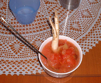 얼마전까지 선화는 왼쪽 사진처럼 간식(?)을 내놓았습니다. 토마토를 간 즙에다 인삼 한 뿌리...원래는 '마'(뿌리의 일종)와 '인삼'을 갈아서 주곤 했는데 인삼 알갱이가 삼키기 더 불편하다는 제 불평을 듣고선 아예 뿌리채 주기로 방침을 바꾼 것이죠. 하지만 이것도 오래 가진 못했습니다. 이렇게 인삼을 씹어 먹으니까 속이 쓰리더라구요. 요즘은 토마토에다 '칡', '홍삼 엑기스' 같은 것(?)들을 내 놓습니다. 선화의 마음이죠. |