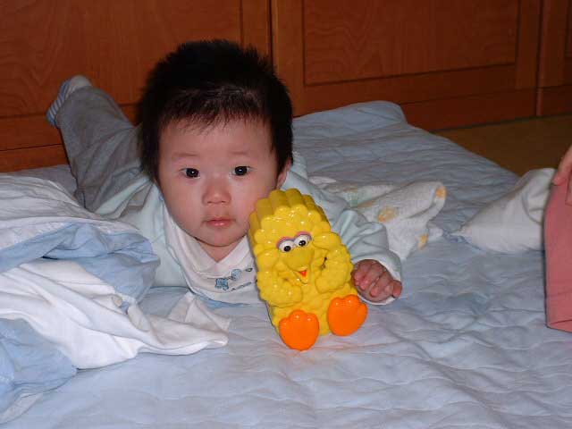 형민이가 2-3개월 때...형민이의 친구들을 소개드린 적이 있습니다. 대표적인 친구는 광등이었지요....광등이가 누군지 다 아시죠? 광등이는 천장에 달려 밝은 빛을 내고 있는 형광등을 일컫는 말입니다. 형민이는 그 당시 항상 천장을 올려다보며 광등이는 놀았었지요....이제 7개월이 다 되어가는 형민이의 친구는 다양합니다. 가장 친한 친구는 누가 뭐래도 "노랭이"입니다. 노랭이는 노란색을 가진 새입니다. 이 새가 무슨 종류인지는 모르겠는데...타조같기도 하고....백조같기도 하고...(선화는 펠리칸이라고 하는데...)하여간....눈을 가리는 날개짓을 반복하면서 아름다운 멜로디를 내는 장난감인데...움직이는 것도 아니고 도망가는 것도 아니라서...늘 형민이 손에 붙들리기 일쑤입니다.