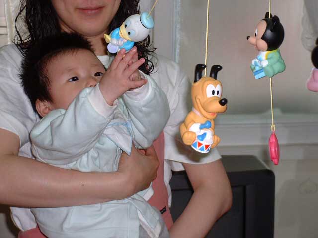 방에 눕거나 앉아서 형민이를 재미있게 해 주는게 노랭이라면.....아빠나 엄마 품에 안겼을 때...어김없이 눈길을 주는 건.....'친구야-들.....'입니다.... '친구야-들'은 '친구들'을 형민이에게 소개하는 말입니다. '친구야-들' (지금부터는 '친구들'이라고 쓸께요...)은 모빌입니다. 주로 디즈니 만화에 나오는 캐릭터들인데...구피,미키마우스,도날드...뭐 이런 종류의 친구들입니다. 얘들이 천장에 모빌 형태로 달려서 까딱까딱 거리고 있는데...형민이는 이 모습을 그냥 두고 볼 수 없는 모양입니다. 두 눈을 크게 뜨고 양 팔과 다리를 파닥거리면서...이 친구들에게 다가가고 싶어하지요....다가가면 뭐하냐구요? 친구들을 어렵게 두 손을 잡아 자기 입에 갖다대는 게 반가움의 표현입니다. 아무리 아파도 '친구들에 대한 신뢰'는 대단합니다.