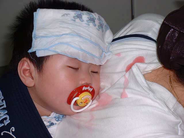 우린 찬물 수건을 가지고 와...형민이의 이마에 얹기도 했는데...형민이가 싫어했습니다. 이렇게 아기가 열성 질환에 시달릴 때는 두가지에 유의해야 합니다. 하나는 너무 고온에 노출시키지 말라는 거지요...이유에 상관없이 고열 자체가 열성 경련등의 신경계 증상을 야기할 수 있습니다. 그래서 찬물수건을 사용하든지 해열제를 사용해서 무조건 열을 내려야 합니다.