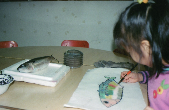 성은이의 정물화를 보면 아이의 솔직한 눈을 볼 수 있습니다. 성은이는 라파엘 미술학원에 3년째 다니고 있습니다. 오빠, 언니가 유치원에 가는 걸 보고 자기도 어딘가 가고 싶다고 시작한 미술 학원이죠. 성은이 미술 실력은 우리가 봐도 놀랄 정도로 발전하고 있습니다. 고등어를 보면서 그림 그리는 모습인데... 정말 고등어 같아요.
