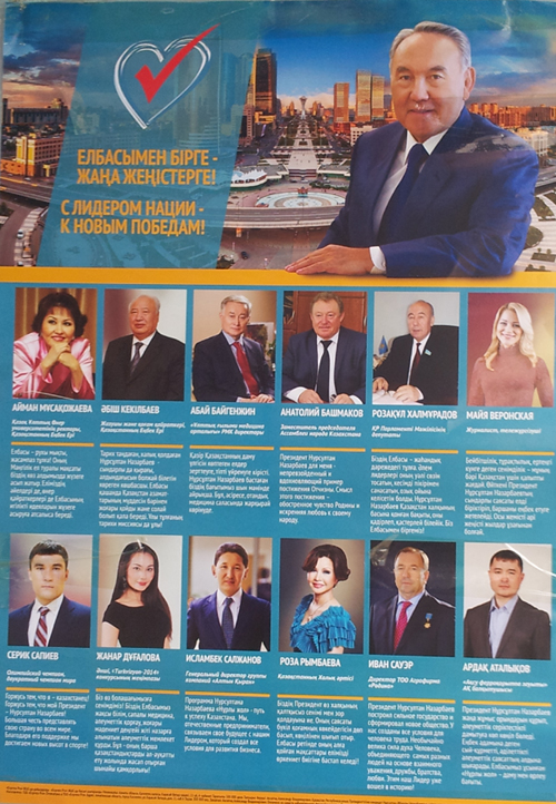 오는 4월 26일에는 카자흐스탄 대통령 선거가 있습니다. 현 대통령 나자르바예프 대통령은 1991년 카자흐스탄 분리 독립 이후 현재까지 장기 집권하고 있습니다. 그는 옛소련 시절 1989년 공산당 서기장을 시작으로 지금까지 카자흐를 이끌고 있는데 카자흐스탄의 고도성장을 이뤄내며 국민의 절대적인 신임을 받고 있습니다. 앞선 2011년 대선에서도 95.5% 득표율로 당선되었고 이번에도 다섯 번째 대선에 도전하게 됩니다. 원래 카자흐스탄은 대통령은 5년 단임제이지만 지난 2007년 상하원 의회가 헌법을 개정하여 1대 대통령에 한해서만 연임제한을 철폐하면서 사실상 종신대통령이 가능한 상태입니다. 위에 있는 공식 선거 포스터만 봐도 현 대통령 후보자의 사진만 크게 나와 있어 은근히 대통령을 지지하고 있음을 보여줍니다.