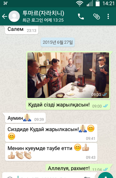 그런데 다음 날 금요기도회 때 루스템으로부터 투마르의 남편이 회개하고 주님께로 돌아왔다는 얘기를 전해 들었고, 순간! 어젯밤 뚜마르가 남편이 예수를 믿게 되었다는 사실을 전하고 싶어 제게 연락했을거라고 생각하게 되었습니다. 다음 날 뚜마르에게 지난 번 방문 사진을 보내며 "하나님이 당신을 축복하시길!" 이라고 늦은 답장을 보내자 뚜마르는 이내 "아멘, 당신에게도 하나님이 축복하시길! 나의 남편이 회개하고 주님께로 돌아왔습니다." 라고 메시지를 보내왔습니다. 바로 그 남편이 한 달이 지난 오늘 , 그녀와 함께 세례를 받은 것입니다. 위는 당시 카작어 대화 내용이 담긴 SNS 내용입니다.