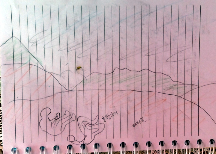 2박 3일의 수련회를 마치고 돌아온 형민이의 표정은 아주 밝아 있었습니다. 그리고 약간 상기된 모습으로 둘쨋 날 산행했던 이야기를 우리에게 거침없이 털어놓았습니다. 둘째 날 오전, 조용히 개인묵상하도록 시간이 주어졌을 때, 형민이와 몇몇 남자아이들은 숙소 뒷편 산을 올랐다고 합니다. 이곳 산은 1년 내내 만년설로 덮인 높은 산들이 첩첩히 산맥을 이루며 이어지기에 가까워 보여도 실제로는 아주 높고 험한 산들입니다. 산을 오르다가 힘들어서 되돌아간 친구들도 있었지만 몇몇 아이들은 눈을 만질 수 있는 곳까지 올라갔다고 합니다(6시간 동안 걸었다고 합니다). 그리고 그들 나름대로 정상이라고 생각한 그 지점에서 특별한 경험을 한 것 같습니다. 하나님이 얼마나 크시고 나는 얼마나 작은 존재인지를... 눈 앞에 펼쳐진 풍광과 등 뒤로 끝없이 솟아 있는 작은 산맥들 사이에서 각자 경험하며 느낀 것들이 있었습니다. 그리고 하나님의 음성을 들은 것 같습니다. 새 소리 외에는 아무 소리도 들리지 않았는데도 거대한 산에 휩싸여 압도되는 가운데 하나님의 크심이 가슴 한가운데로 크게 울렸나 봅니다. 사진기나 휴대폰을 소지할 수 없기에 맨 몸으로 올라갈 수밖에 없었고, 사진 한 장 남길 수 없는 상황이 너무 아쉬웠는지 형민이는 그 자리에서 간단한 스케치를 남겼습니다. 자기가 보고 들은 것을...