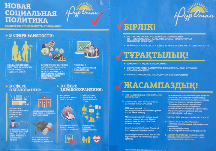 한국에서도 최근 총선이 있었지만 카자흐스탄도 지난 3월 21일 국회의원을 뽑는 총선이 있었습니다. 그 결과 현 대통령이 이끄는 집권당인 '누르 오탄(조국의 빛)' 당이 82.15%를 득표하며 압승을 거뒀습니다. 그 뒤를 이어 제 2당이 된 '악 졸(밝은 길)' 당 역시 친여 야당인 것을 고려할 때(7.18% 획득) 앞으로도 의회는 행정부를 제대로 견제하지 못할 것으로 보입니다. 소련 붕괴 전인 지난 1989년 카자흐스탄 공산당 제 1서기를 맡아 최고 권력자가 되었고 1990년에 초대 대통령에 선출된 뒤 지금까지 26년째 권좌를 지켜오고 있는 나자르바예프 현 대통령은 지난 해 대선에서도 98%의 지지를 얻어 오는 2020년까지 대통령 임기를 확정한 바 있습니다. 1940년 생인 대통령은 올해로 만 76세가 되기에 대통령의 건강 상태나 유고시의 위기 상황이 여전히 카자흐스탄 최고의 불안요소로 자리잡고 있습니다.
