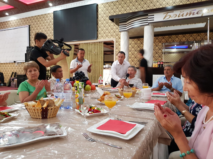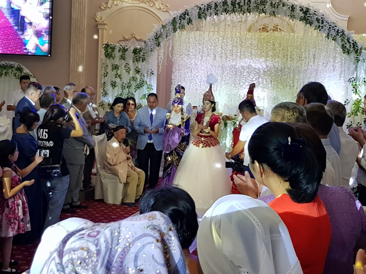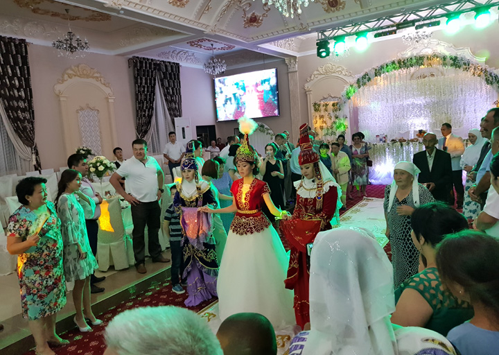유목민 카자흐인들의 결혼식은 며칠에 걸쳐 이뤄집니다. 신부측과 신랑측이 따로 결혼식을 하는데 그 때마다 상대편 가족 친지들이 방문하게 되고 주변 지인들을 초청해서 큰 잔치를 열지요. 신부측 결혼식을 여기 말로 '커즈 오자투' 라고 하는데 단어의 뜻은 '신부를 (시댁으로) 떠나 보낸다'는 의미입니다. 커즈 오자투가 저녁 6시 시작인데 낮 1시부터 신랑측 신부측 가족들이 먼저 만나 상견례를 하고 서로 축하하는 '코달륵' 이라는 잔치가 먼저 열립니다. 사진에 보이듯이 이곳의 무슬림들은 기도하거나 복을 구할 때마다 항상 두 손을 가슴 앞으로 모읍니다. '코달륵'도 4시간 동안 진행되는 노래와 춤, 음식이 가득한 잔치였습니다.