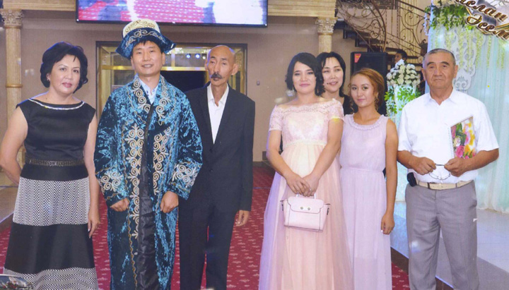 그 날 저녁 6시에 시작된 '커즈 오자투'에서 이성훈 M이 신부측에서 선물한 카자흐 전통의상을 입고 신부측 가족과 함께 서 있는 모습입니다. 카자흐 사람들은 이렇게 외지에서 온 이방인을 환대할 때 카작 전통 의상을 선물하고 축복하는 전통이 있습니다.