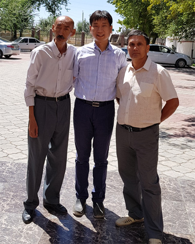 좌측은 구글 지도에서의 위치입니다. 현재 위치가 파란 점으로 표시되어 있는데 우즈베키스탄 국경에 접해 있음을 알 수 있습니다. 사리아가쉬는 카자흐스탄 쉼켄트에서는 멀고 우즈베키스탄 타쉬켄트에 인접한 지역이지요. 좌측 신랑 아버지와 우측 신부 아버지와 함께 찍은 사진입니다. 결혼은 카작 민족 전통에도 무척 큰 잔치이기에 신부와 함께 일하는 한국인 의사를 반갑게 맞아 주셨습니다.