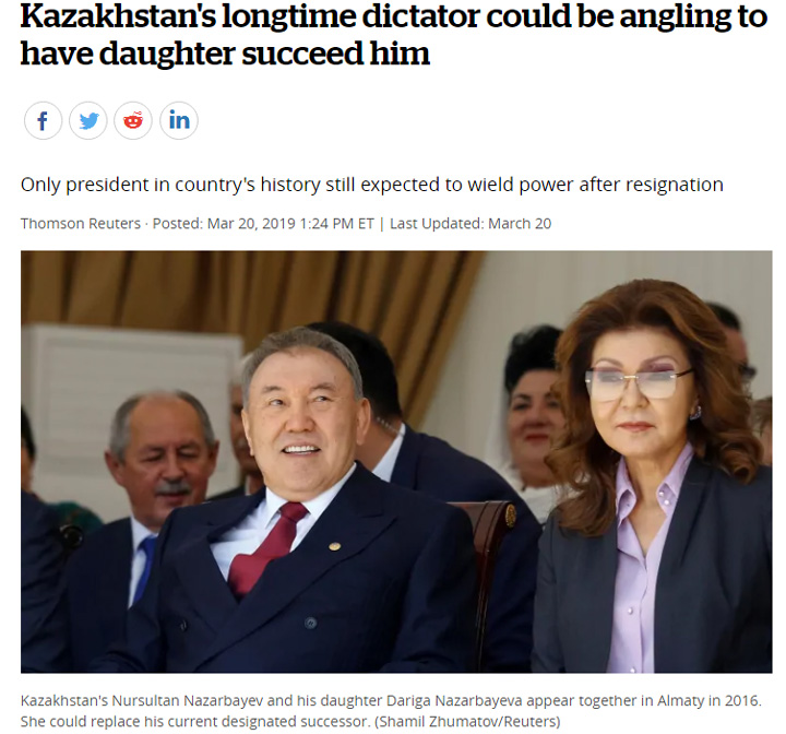 이렇게 내년에 대선이 예고된 가운데 나자르바예프 전 대통령의 장녀인 다리가 나자르바예바가 상원의장에 오르면서 내년에 장녀 다리가가 대통령에 당선될 것이라는 소문이 돌고 있습니다. 나자르바예프 전 대통령이 대통령직은 사임했지만 국가안보회의 의장, 집권 여당인 '누르 오탄' 당 대표, 헌법위원회(헌법재판소 격) 위원 등의 직책은 그대로 유지하고 있기에 장녀를 대통령에 앉히고 상왕 역할을 할 거라는 분석이 설득력을 얻고 있습니다. 종신집권을 박차고 사임한 배경에는 최근 카자흐스탄의 경제난, 장기집권에 대한 국민들의 불만, 자신이 원하는 후임자를 내세우기 위한 정치적 희생 등이 작용한 것으로 보입니다. 우즈베키스탄 카리모프 전 대통령이 후계자 지명도 못하고 2016년 급사한 전례도 있기에 지금이 78세의 나자르바예프 대통령이 30년 독재를 끝내고 자기가 원하는 사람에게 정권 이양을 할 때라고 본 것 같습니다.