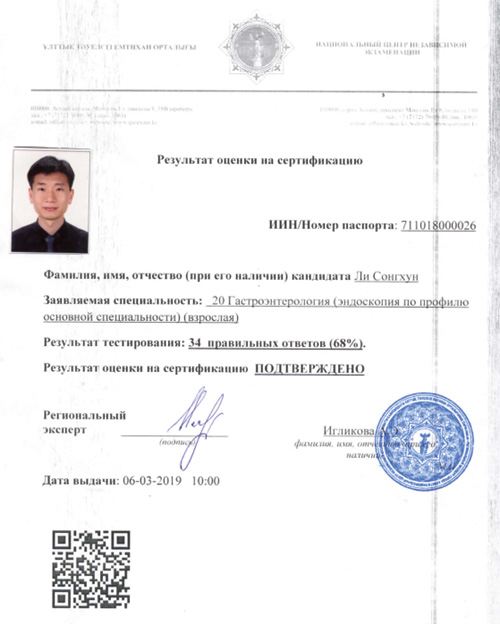시험을 치고 나면 그 자리에서 바로 성적이 나오는데 위 사진이 결과지입니다. 50문제 중에 34문제를 맞혀 68점으로 통과라고 적혀 있는 거 보이시지요. 한국에서는 60점대 시험 점수를 받아본 적이 없지만 이곳에서는 68점으로 통과라니 그저 고맙고 반가울 따름입니다. 그런데 문제는 그 이후에 발생했습니다. 현지 전문의 자격증을 받기 위해 이 성적표와 지금까지의 모든 서류(의대 졸업장 인증서부터 시작해서)를 알마티의 '쫀'이라는 행정기관을 거쳐 알마티 보건국으로 전자 송부했는데 알마티 시로부터 현지면허를 내줄 수 없다는 결과를 통보받았기 때문입니다. 그 근거로 제시한 규정들은 다 최근에 만들어진 것이고 그 내용을 이해하기 어려웠습니다. 동일한 행정절차를 아스타나 쫀을 통해서도 밟아 봤는데 결국 똑같은 답변만 돌아왔습니다. 이 문제로 시 보건국을 찾아 가보려다가 그만뒀습니다. 별 도움이 안 될거라는 생각이 들어서입니다.