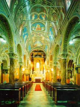 전체적으로 고요하고 차분한 실내 분위기에 길다란 의자가 가지런히 놓여 있었습니다. 미사를 집전하는 단상 뒤쪽에는 개신교인으로선 이해하기 힘든 여러 성인들의 초상화와 조각들이 세워져 있었지만 교회의 지붕과 벽면 상부 쪽을 채우고 있는 수 많은 벽화 속에서는 성경 속에 나오는 여러 이야기와 영광을 받으시는 삼위일체 하나님과 관련한 주제를 많이 볼 수 있었습니다. 그리고 서머나 교회의 감독이었던 폴리갑과 관련된 여러 성화들도 볼 수 있었습니다.그 중에서도 눈에 띄는 것은 바로 서머나의 감독 폴리갑이 화형을 당하는 장면을 묘사한 성화였습니다.